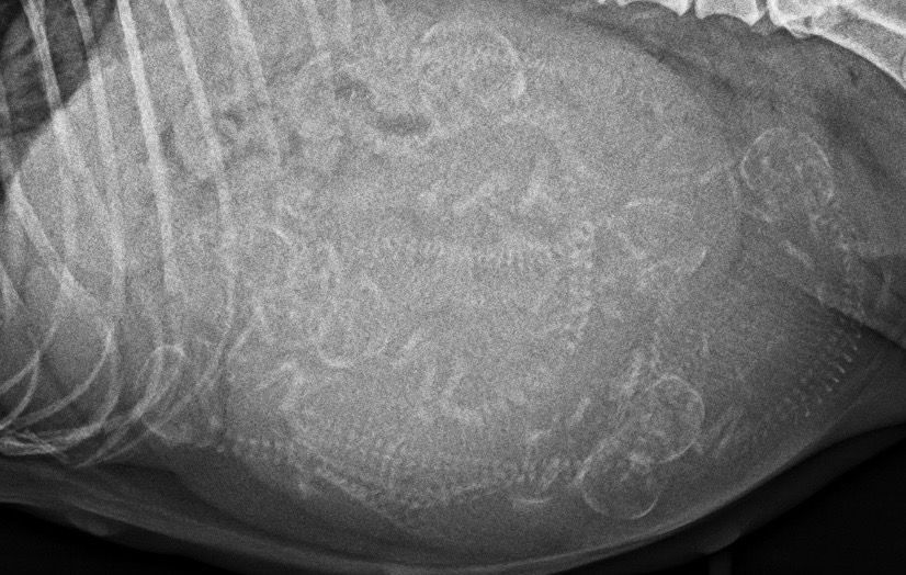 Wir entschlossen uns zur Sicherheit zu einem Röntgen an Tag 55 und mussten feststellen, dass wir nicht nur 1-2 Welpen nicht gesehen hatten, sondern 3-5.