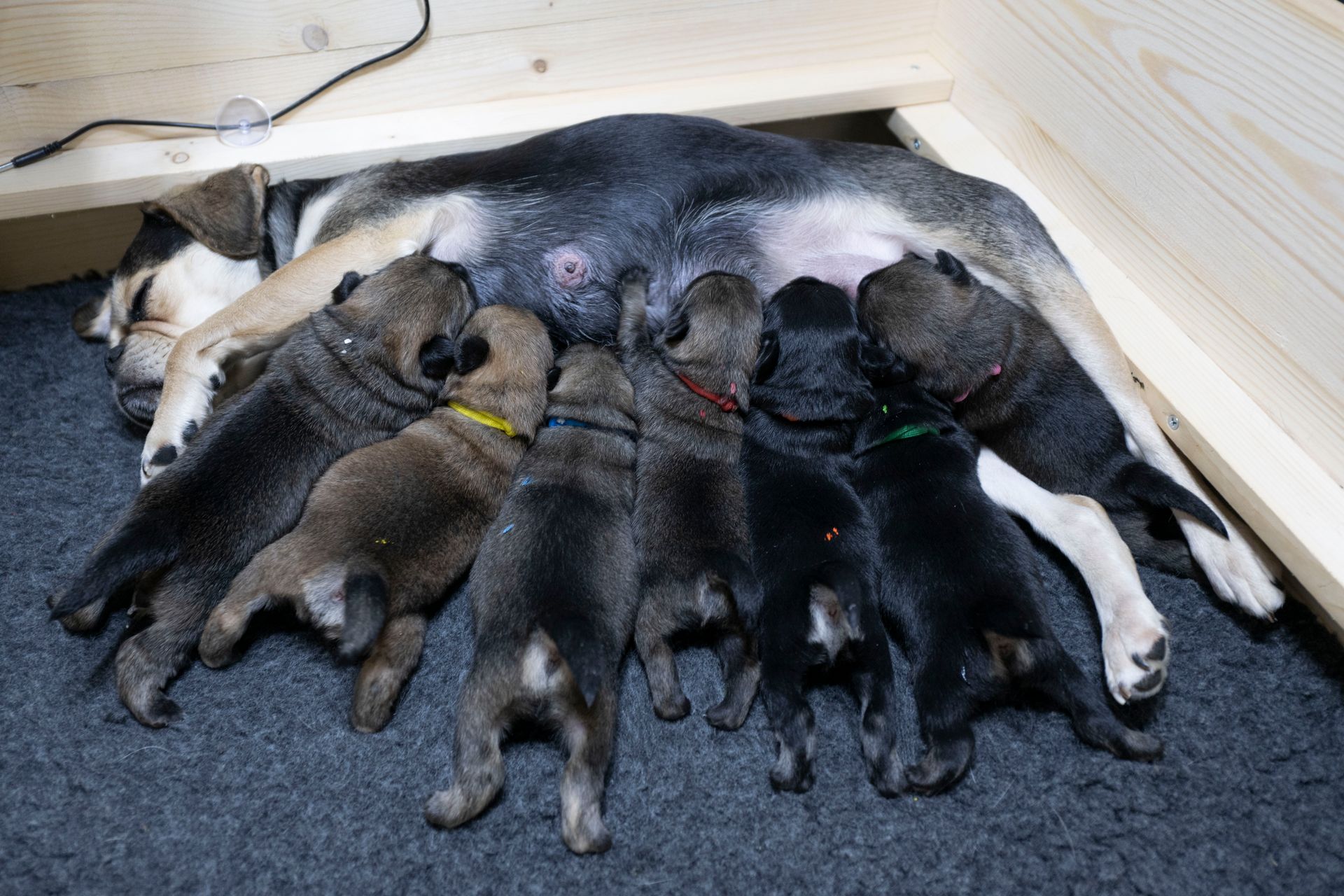 Beim Trinken stellen die kleinen Welpen immer ihre Ruten grade nach hinten oder oben.